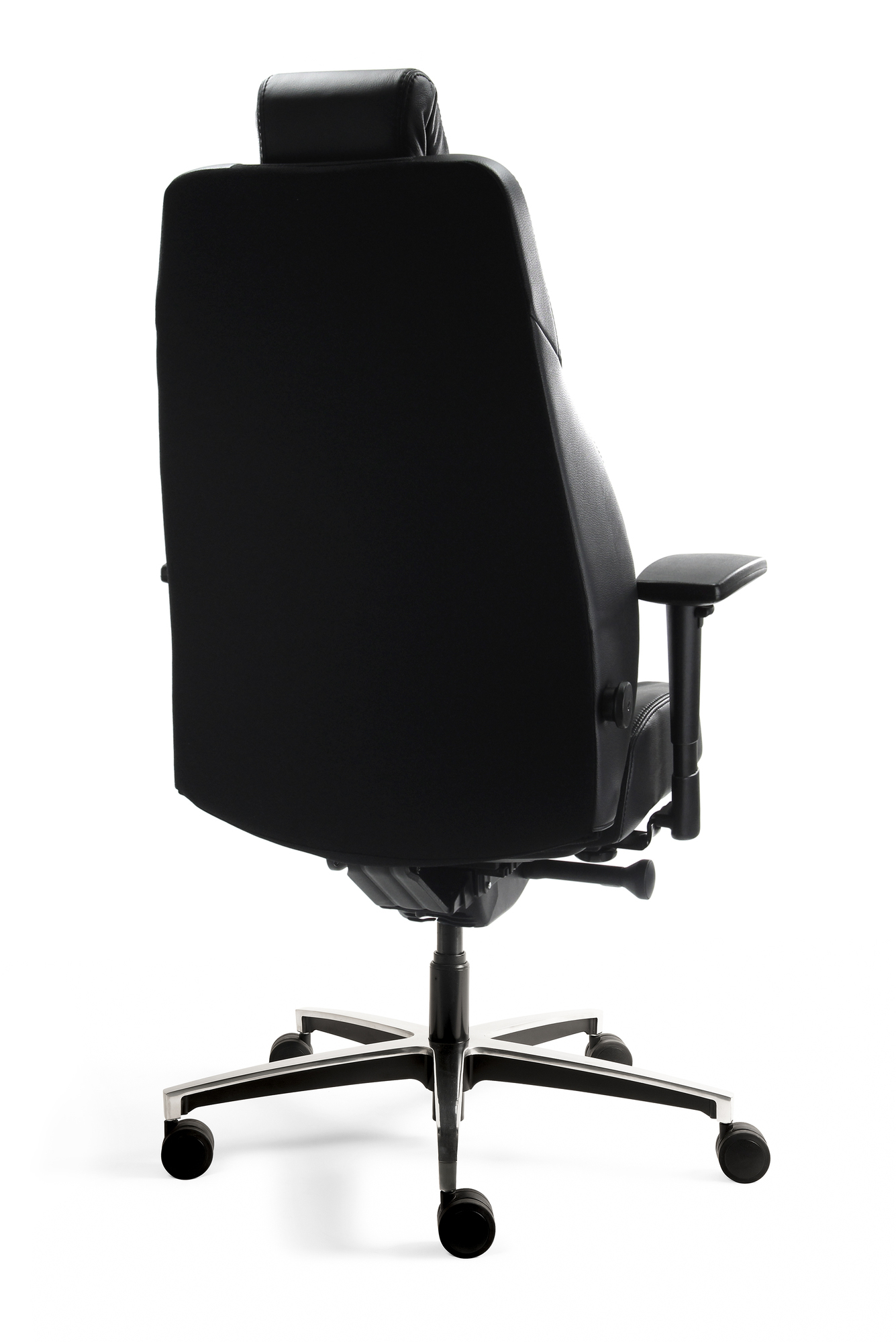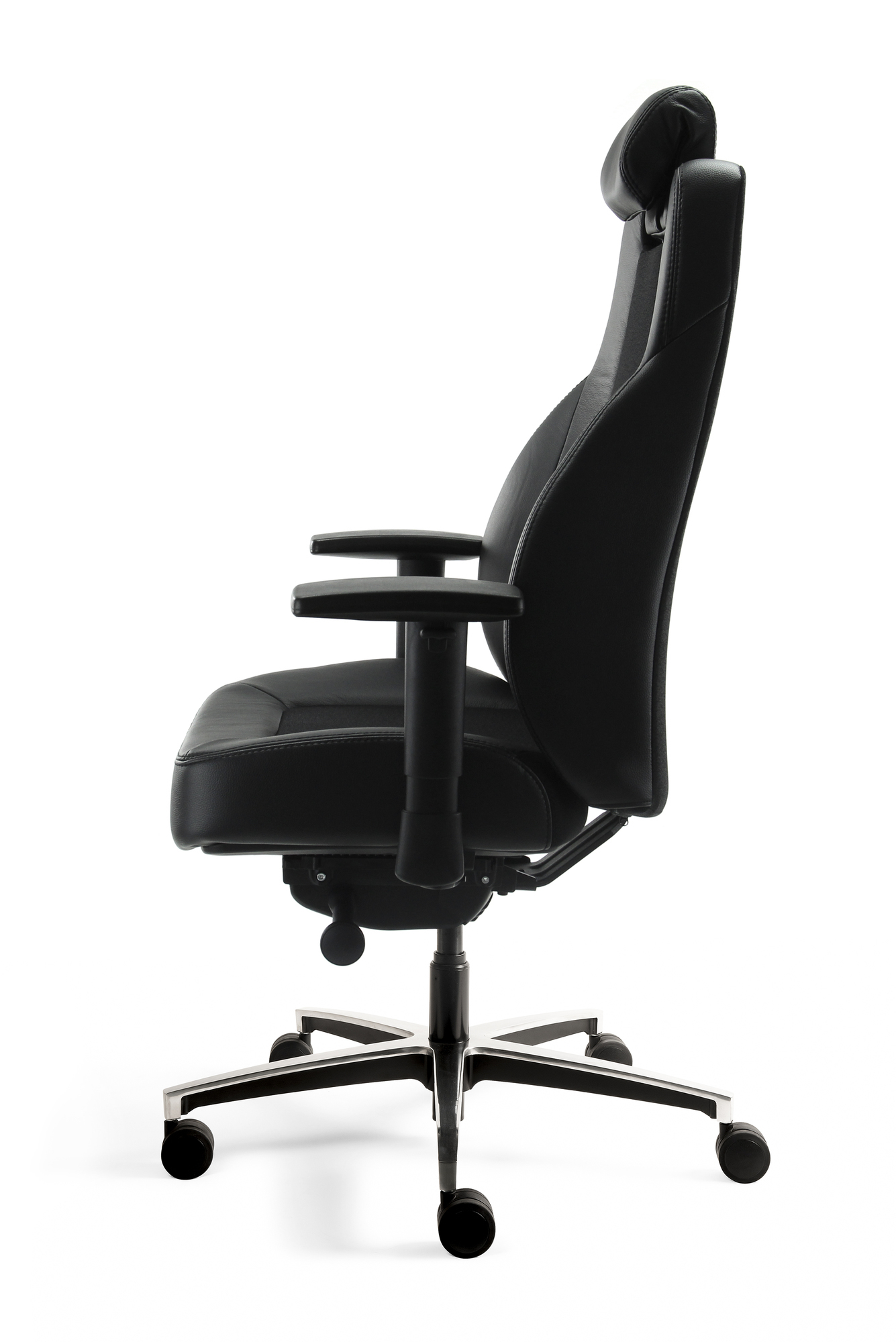 Leitstellenstuhl Operator 24/7 für Kontrollraum, Pforte, Leitstand oder sonstigen Schichtbetrieb. robuste Wippmechanik mit Körpergewichtseinstellung hochwertiger Komfortsitz in Kaltschaumtechnik  ergonomische Rückenlehne stufenlos in der Neigung einstellbar hochwertige pneumatische Lordosenstütze und Sitztiefenfederung Rücken und Seitenelemente sind mit schwarzem Kunstleder bezogen  Kopfstütze integriert (Optional: höhenverstellbar) vollgepolsterte Armlehnen höheneinstellbar und nach oben wegklappbar, mit schwarzen Echt-Leder bezogen Fußkreuz Aluminium poliert ausgelegt für 3-Schichtbetrieb als Leiststellenstuhl belastbar bis 200 kg auf Wunsch individuelle Sitzhöhe möglich