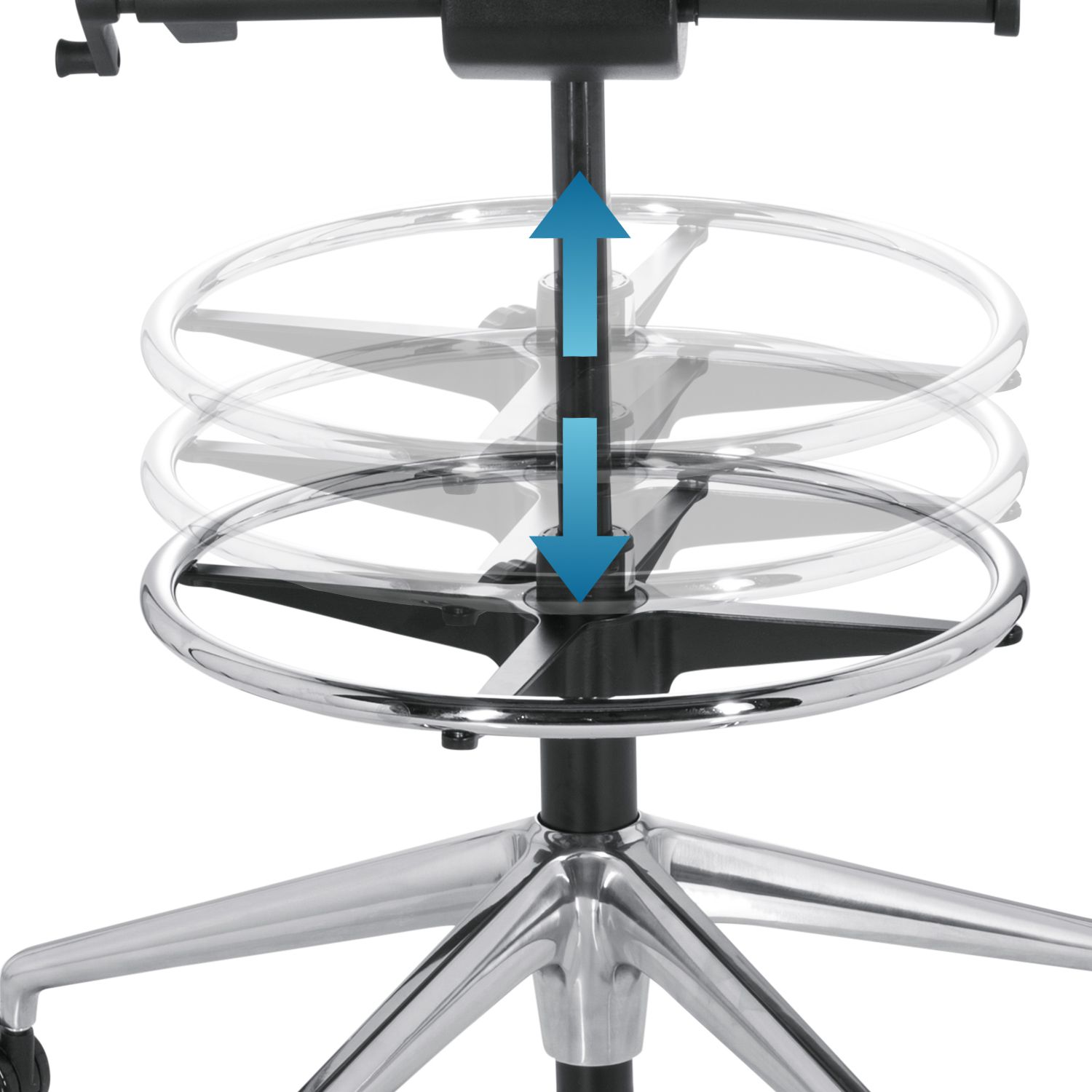 Der Counterstuhl HALIFAX WORK mit ergonomisch geformter Rückenlehne besitzt eine extra tiefe Sitzfläche und ist somit auch für größere Menschen geeignet. Ob in der Produktion, am Empfangstresen oder in professionellen Counterbereichen – der erhöhte Arbeitsstuhl mit höhenverstellbarem Fußring passt sich durch seine hohe Flexibilität jedem anspruchsvollen Arbeitsumfeld an. Durch die atmungsaktive Netzbespannung der Rückenlehne sorgt dieser Arbeitsstuhl auch bei längerem Sitzen für ein angenehmes Körperklima. Dieser Arbeiststuhl verfügt darüber hinaus über eine Synchron-Mechanik, eine Lordosenstütze und 3D-Armlehnen und ist somit anderen Arbeitstühlen technisch weit voraus. Die extra tiefe Sitztiefe lässt sich in mehreren Stufen einstellen, die Synchron-Mechanik ist 3-fach arretierbar und individuell auf das Körpergewicht einstellbar, das Lordosenelement setzt sich in türkis farblich vom Stuhl ab und setzt eine stylischen Designakzent. Der Fußring aus robustem Aluminium dient als komfortable Fußablage und lässt sich individuell in der Höhe verstellen. Der Stuhl besitzt ein hochwertig verchromtes Aluminium-Fußkreuz und Spezailrollen für Hartböden.