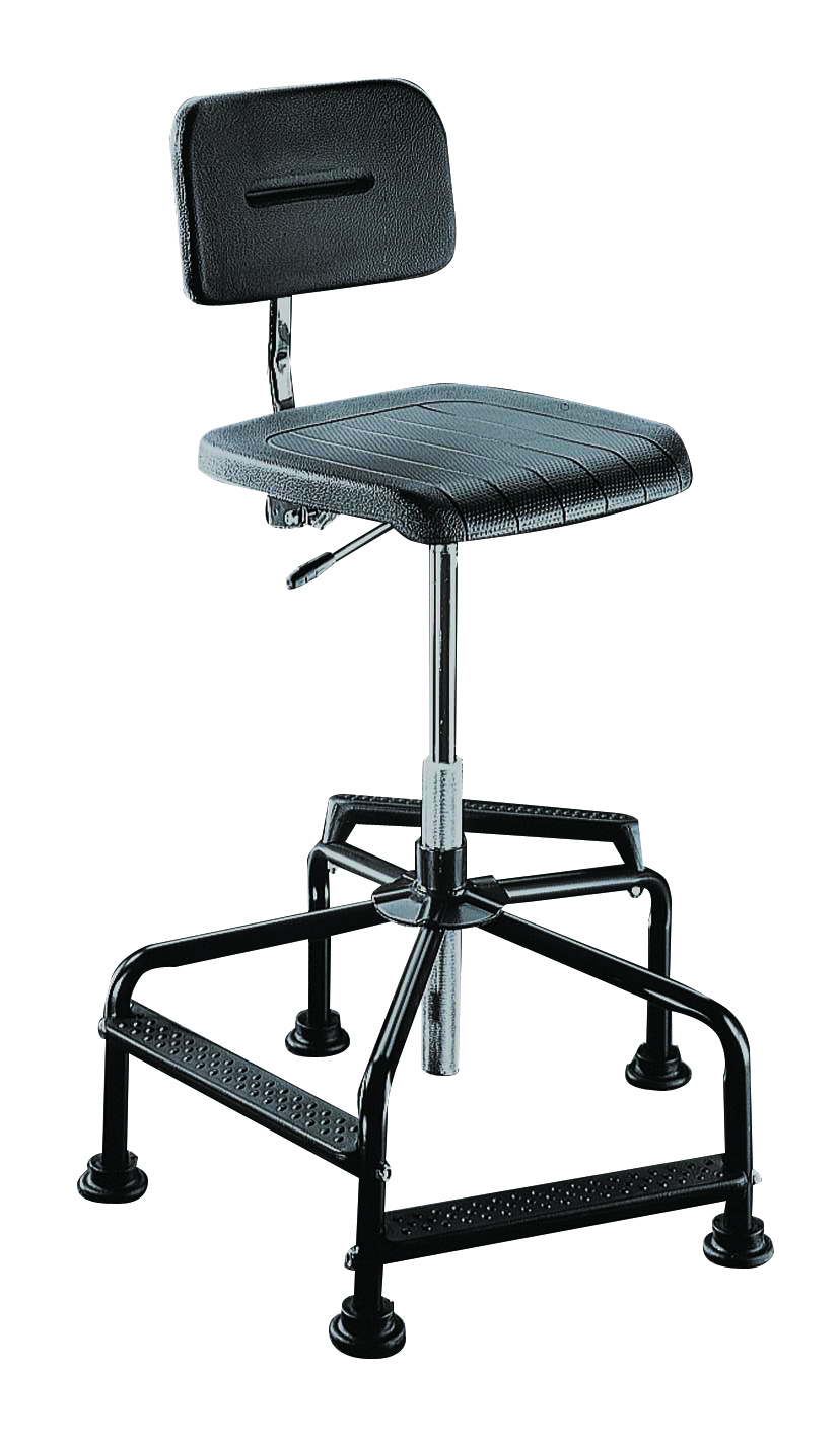 Extra hoher Arbeitsstuhl mit drei unterschiedlich hohen PU-Fußstützen, PU-Teile mit Stahleinleger, pendelnde Rückenstütze in der Höhe verstellbar, Rückenlehne in der Neige verstellbar, mit Gleitern