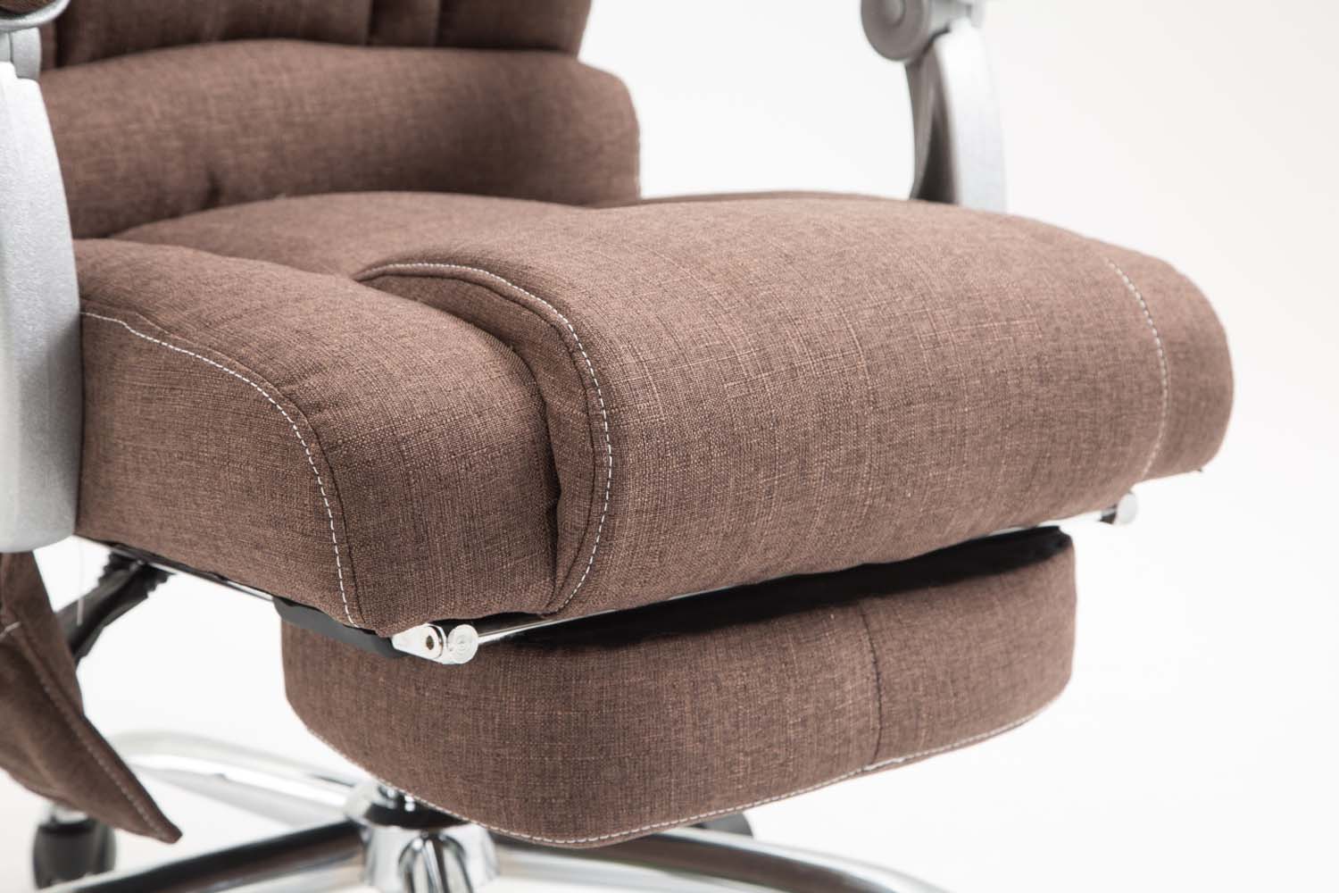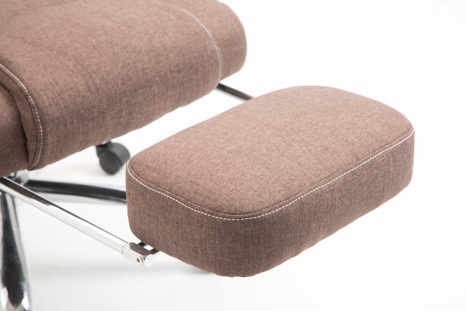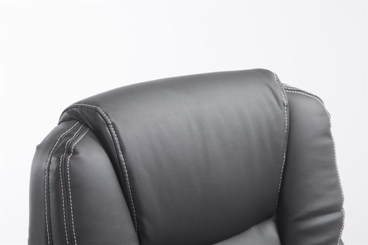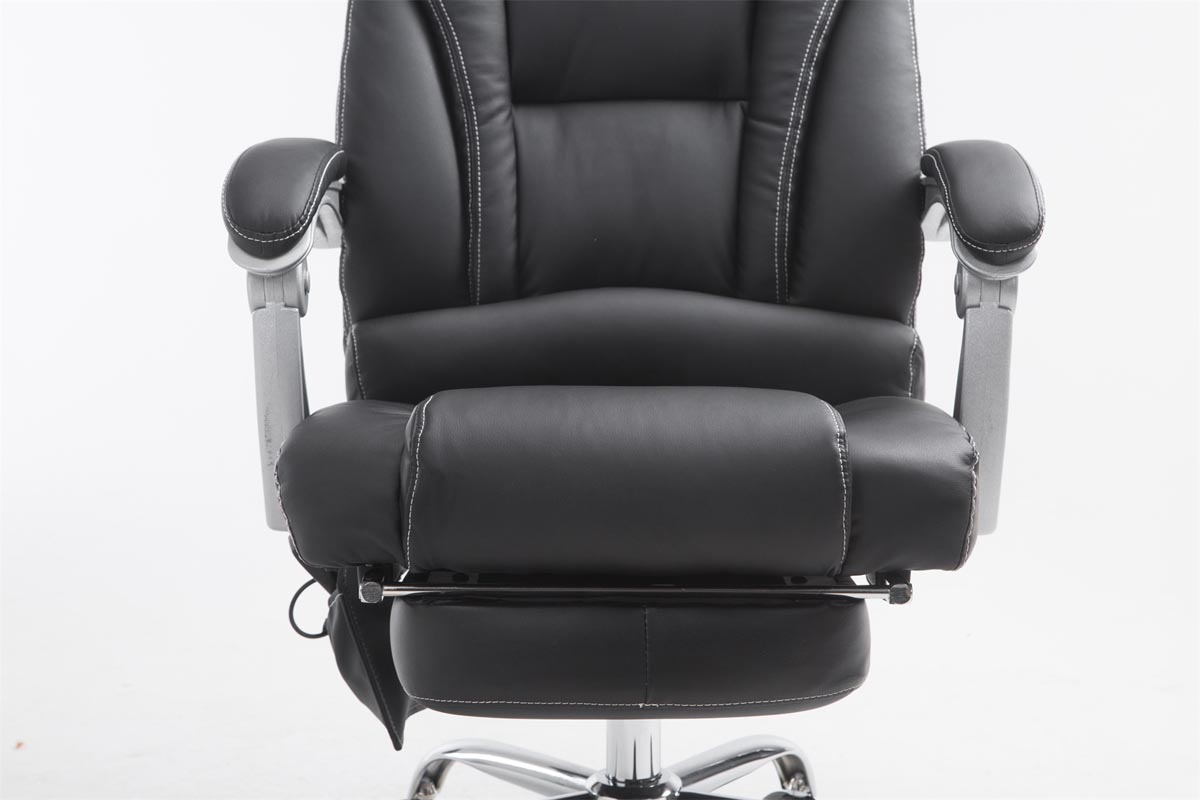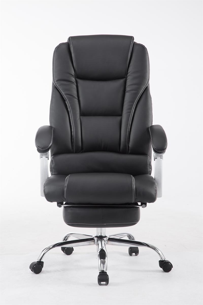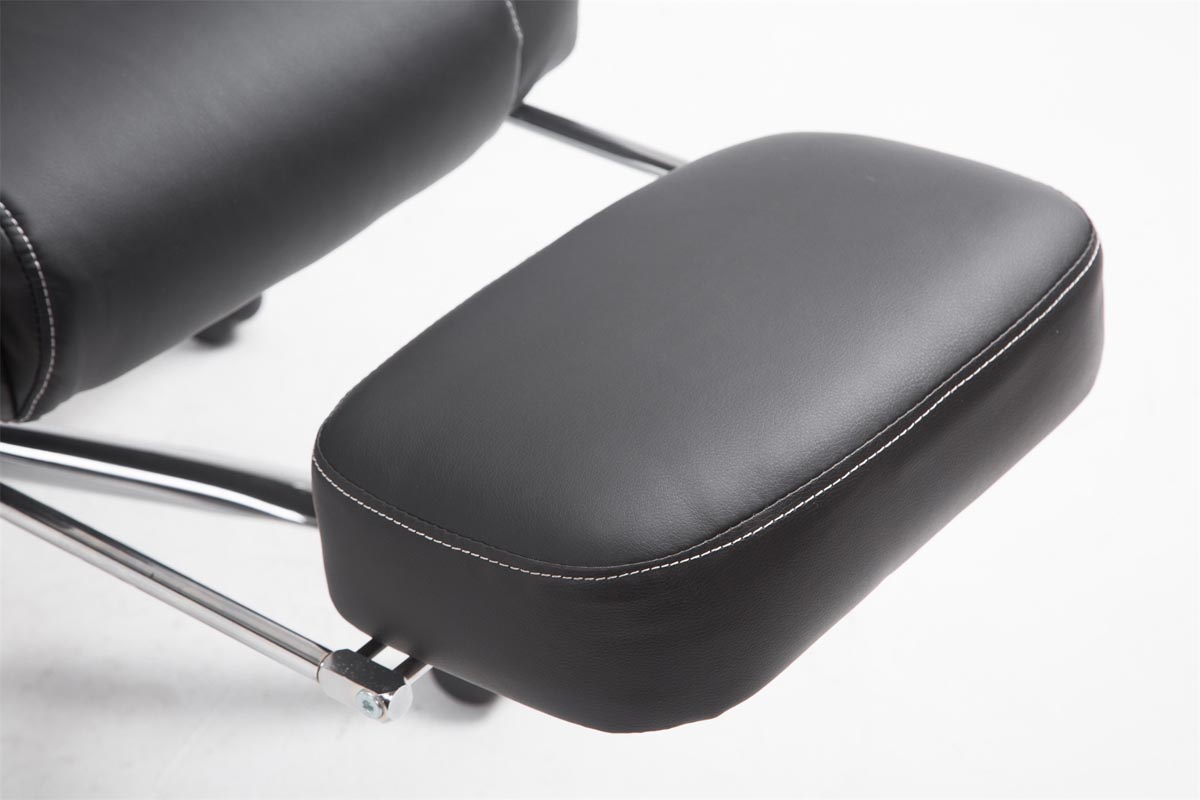 Der elegante-Chefsessel Pacific mit Kunstleder- oder schwarzem Stoffbezug bietet so einige Vorteile. Beide Bezüge sind nicht nur besonders pflegeleicht sondern sehen durch ihre Zierkanten auch sehr edel aus. Sie sind elastisch und ziehen sich bei Entlastung wieder glatt. Aus diesem Grund ist eine hohe Lebensdauer des Sitzbezuges garantiert. Die lange Rückenlehne mit ausgeformtem Polster in der Kopfstütze, aber auch die weiche Polsterung der Armlehnen, ermöglichen ein komfortables Arbeiten. Dank der stufenlos verstellbaren Sitzhöhe garantiert der Bürostuhl Pacific zudem jederzeit ein ergonomisches Sitzen. Die leicht verstellbare Fußstütze und Rückenlehne sorgen zusätzlich für eine angenehme Pause zwischendurch, bei der sich entspannt zurückgelehnt werden darf und die Beine hochgelegt werden können. Dabei steht er standsicher auf fünf Leichtlaufrollen und einem Gestell aus Metall in Chromoptik. Egal ob Hart- oder Teppichböden - Sie werden immer leicht und locker über den Boden rollen können. Die maximale Belastbarkeit liegt bei 150 kg.