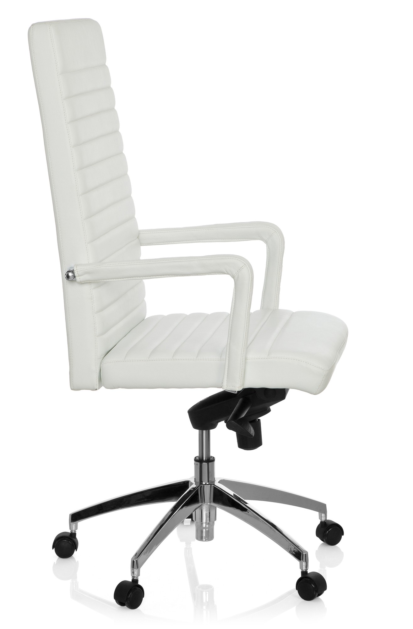 Die Formgebung des LENGA könnte aus der Feder eines bekannten italienischen Designers stammen. Klare Linien, edle Materialien und eine hochwertige Ausstattung sind die überzeugenden Zutaten dieses extravaganten Bürostuhles. Der hochwertige Bezug aus echtem Leder ist besonders robust und bequem, die moderne Knie-Wippmechanik lässt sich mehrfach arretieren und individuell an das Körpergewicht anpassen. Das verchromte Fußkreuz rundet das elegante Design gekonnt ab und sorgt für einen sicheren Stand des Stuhles.