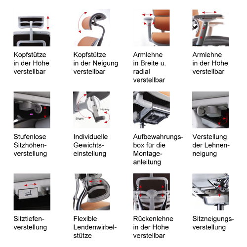 Innovatives Design verbidnet sich mit maximalen individuellen Einstellmöglichkeiten. Sie können die Sitzhöhe, Sitztiefe, Sitzneigung, Höhe und Winkel der Armlehen, die Neigung, Härte und Höhe der Rückenlehne und auch die Höhe und die Neigung der Kopfstütze individuell einstellen. Die kinderleichte und intuitive 1-Finger-Bedienung ermöglicht Ihnen dabei einen schnellen und präzisen Zugriff auf alle Einstellmöglichkeiten. So können Sie innerhalb kürzester Zeit Ihre perfekte Sitzposition finden und stundenlang entspannt arbeiten. Die Lendenwirbelstütze hält dabei Ihren Rücken in der perfekten Position für ein angenehmes und entspanntes Sitzen.