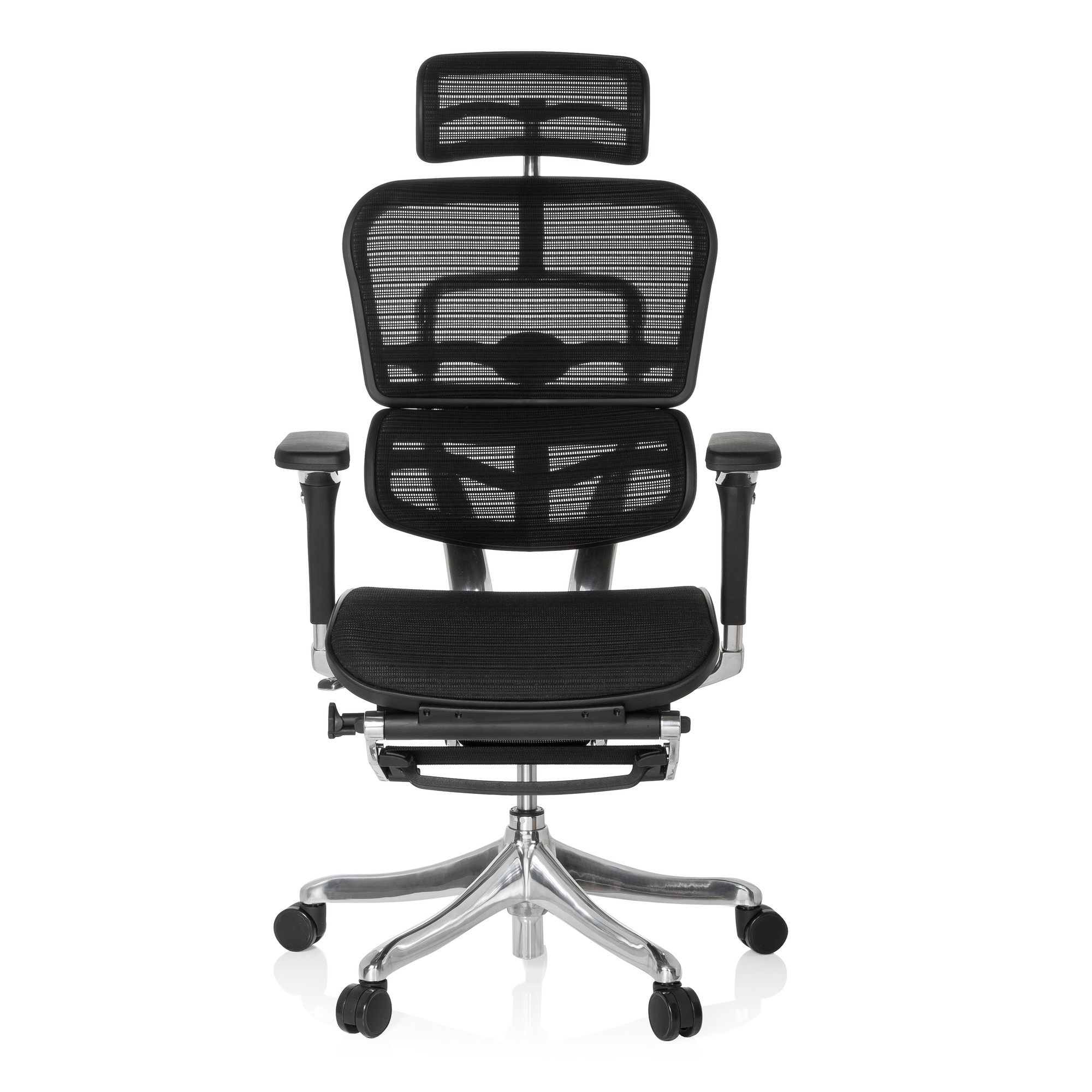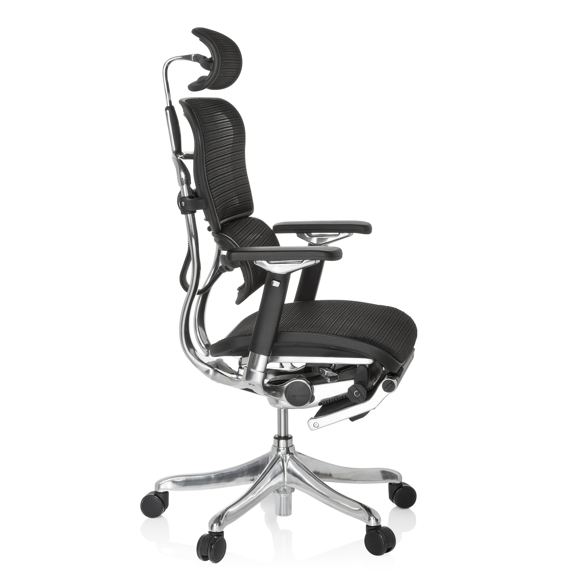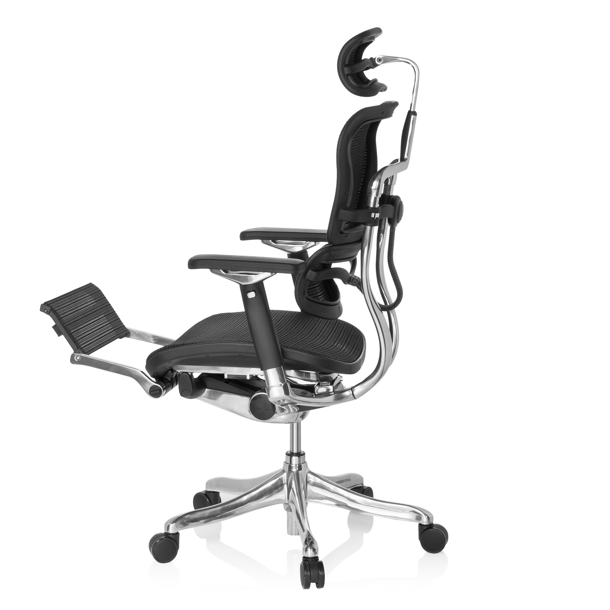 Der High-Tech-Bürostuhl ERGOHUMAN PLUS LEGPRO paart innovatives Design mit individuellen Einstellmöglichkeiten wie 4D-Armlehnen sowie Sitzneige- und Sitztiefenverstellung. Die Sitzhöhe, die Neigung, Härte und Höhe der Netz-Rückenlehne und nicht zuletzt die Höhe und die Neigung der Kopfstütze lassen sich ebenfalls individuell einstellen.Die serienmäßige Beinablage lässt sich im Handumdrehen ausklappen und erlaubt so ein noch nie dagewesenes Sitzgefühl! Ideal um die müden Knochen nach oder während eines langen Arbeitstages zu entspannen - und das in bequemer Liegeposition. Bei Nichtgebrauch lässt sich die Design-Beinablage natürlich nahezu unsichtbar unter dem Stuhl verstauen. Die kinderleichte und intuitive Bedienung ermöglicht schnellen und präzisen Zugriff auf alle Einstellmöglichkeiten. Mit nur einem Hebel haben Sie Zugriff auf alle Stuhlfunktionen - innerhalb kürzester Zeit können Sie Ihre perfekte Sitzposition finden und stundenlang entspannt arbeiten. Die flexible Lendenwirbelstütze hält Ihren Rücken in der perfekten Position für ein angenehmes und entspanntes Sitzen. Sämtliche Teile und Mechaniken sind massiv gefertigt und auf den dauerhaften Gebrauch über viele Jahre hinweg ausgelegt. Hochwertige Materialien und langlebige Bezüge garantieren Ihnen ein außergewöhnliches Sitzvergnügen. Wir empfehlen den ERGOHUMAN PLUS LEGPRO bis zu einer maximalen Körpergröße von 1,85m.