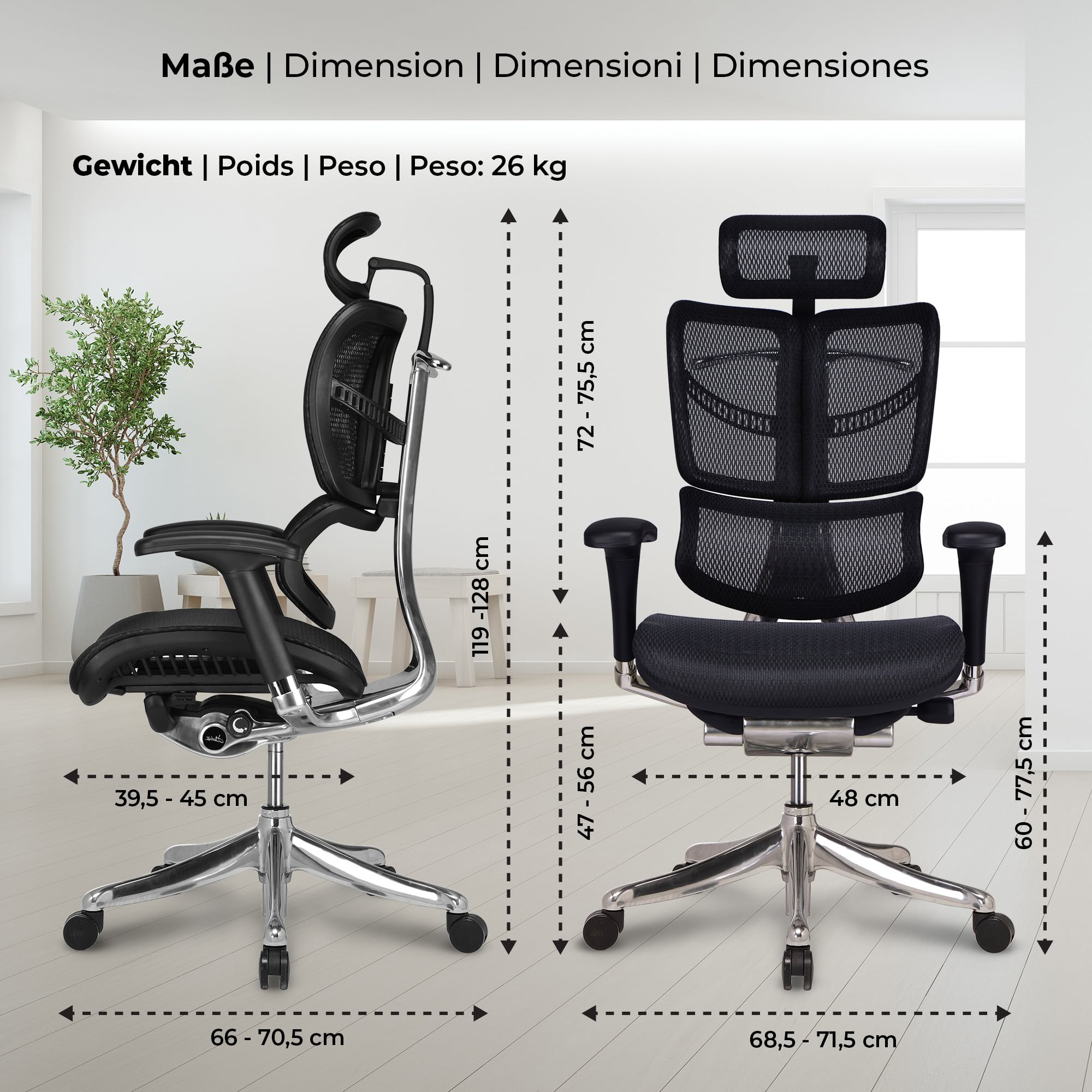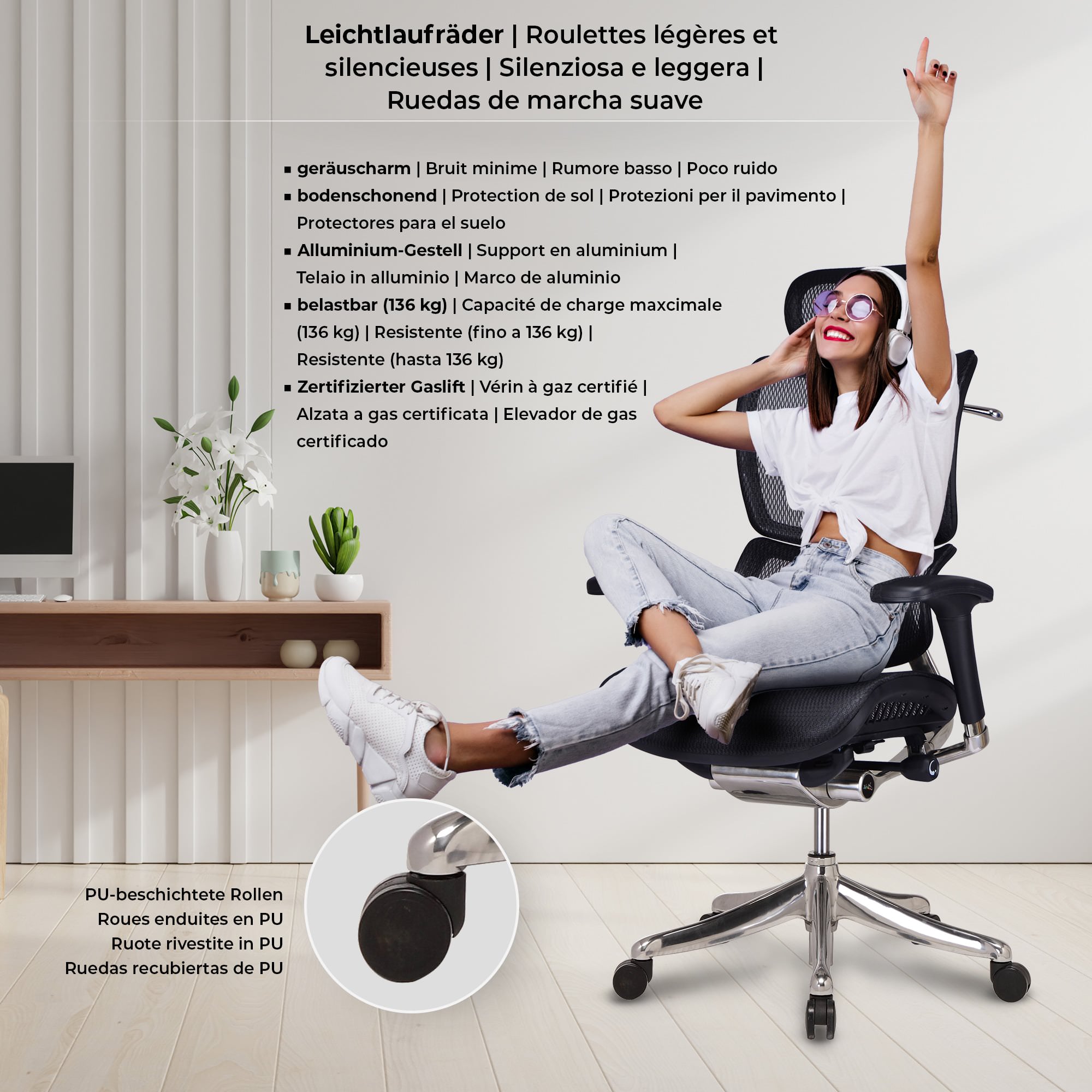 Der Netzbezug ist schick und funktional zugleich. Neben Atmungsaktivität überzeugt der Stoff durch hohe Strapazierfähigkeit. Rahmen und Gestell bestehen aus schwarzem Nylon sowie aus Aluminium in moderner Chrom-Optik. Der Stuhl bewegt sich auf PU-beschichtete Rollen, die empfindliche Böden schonen und geräuscharm sind.