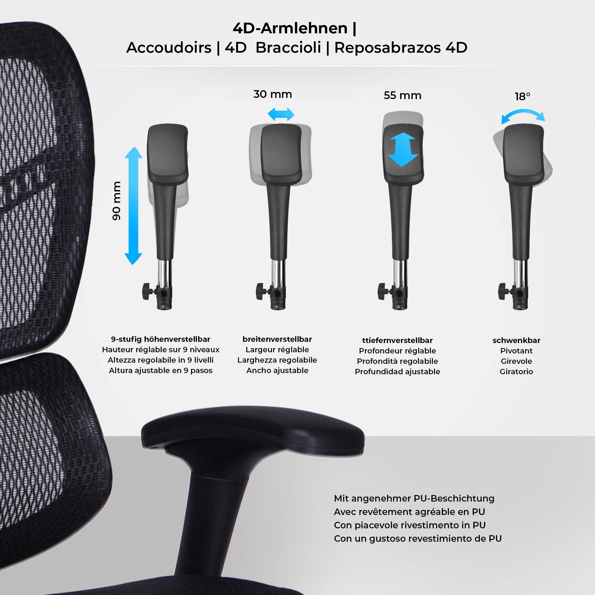 Die üppige Sitzfläche weist eine Krümmung auf, die die Belastung gleichmäßig auf Oberschenkel und Gesäß verteilt. Schließlich sorgen die 4D-Armlehnen für Entlastung der Schultern und Nackenpartie. 4D steht in diesem Zusammenhang für eine vierdimensionale Verstellbarkeit: Neben Höhen- und Tiefenverstellbarkeit sind die Armlehnen schwenkbar und in der Breite adjustierbar.