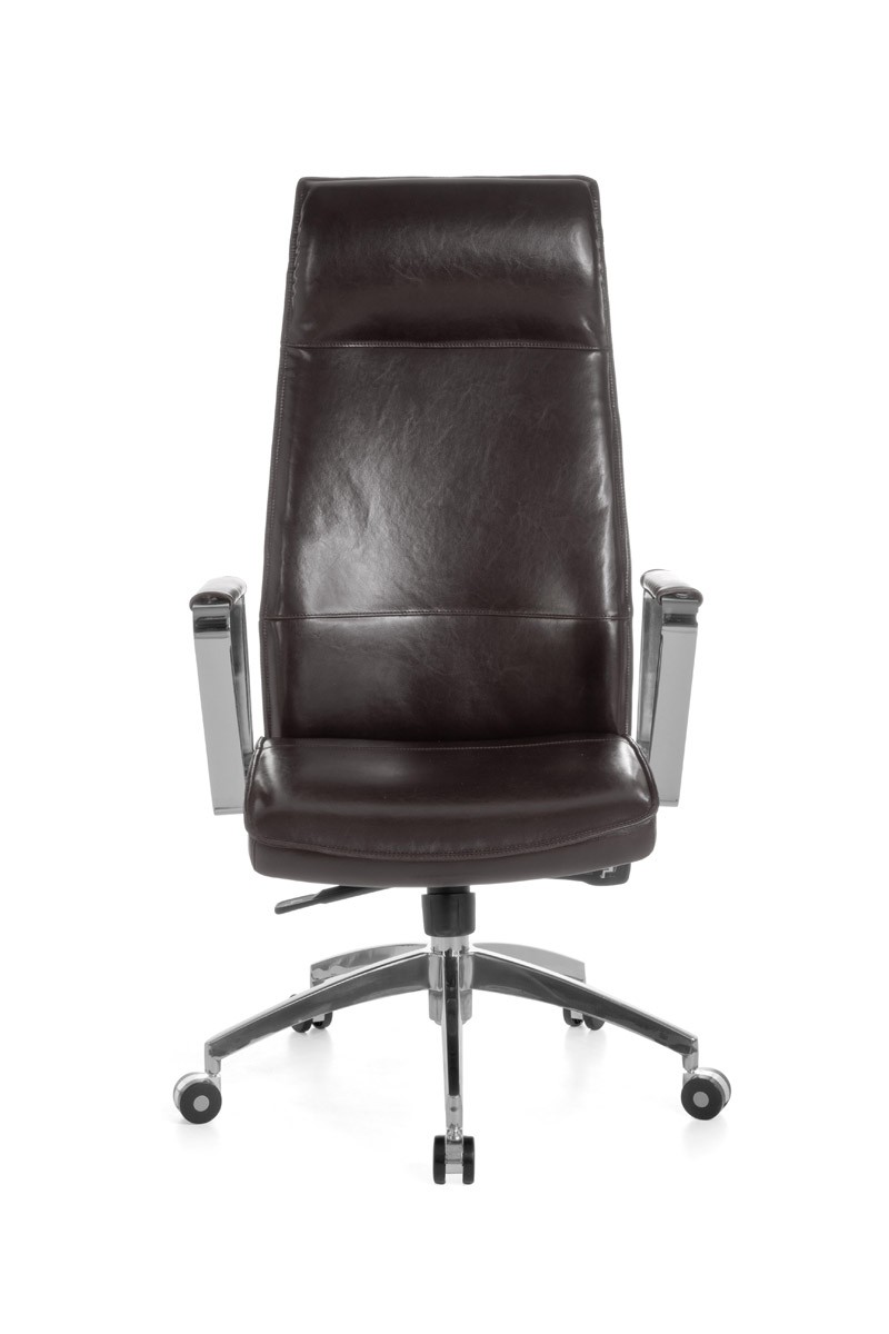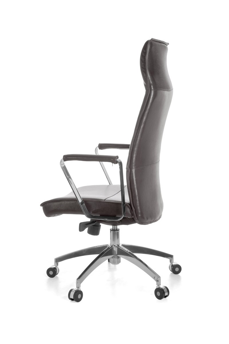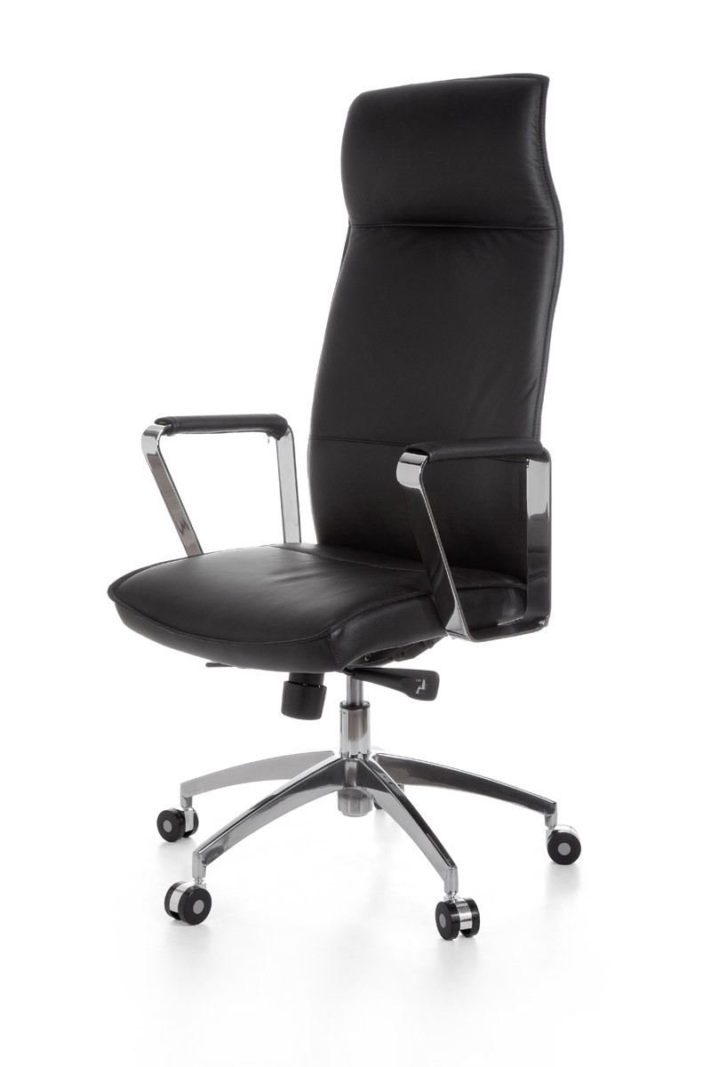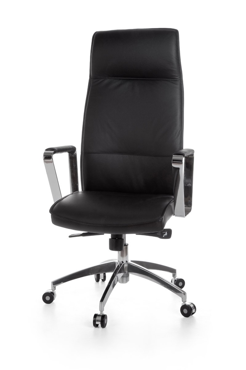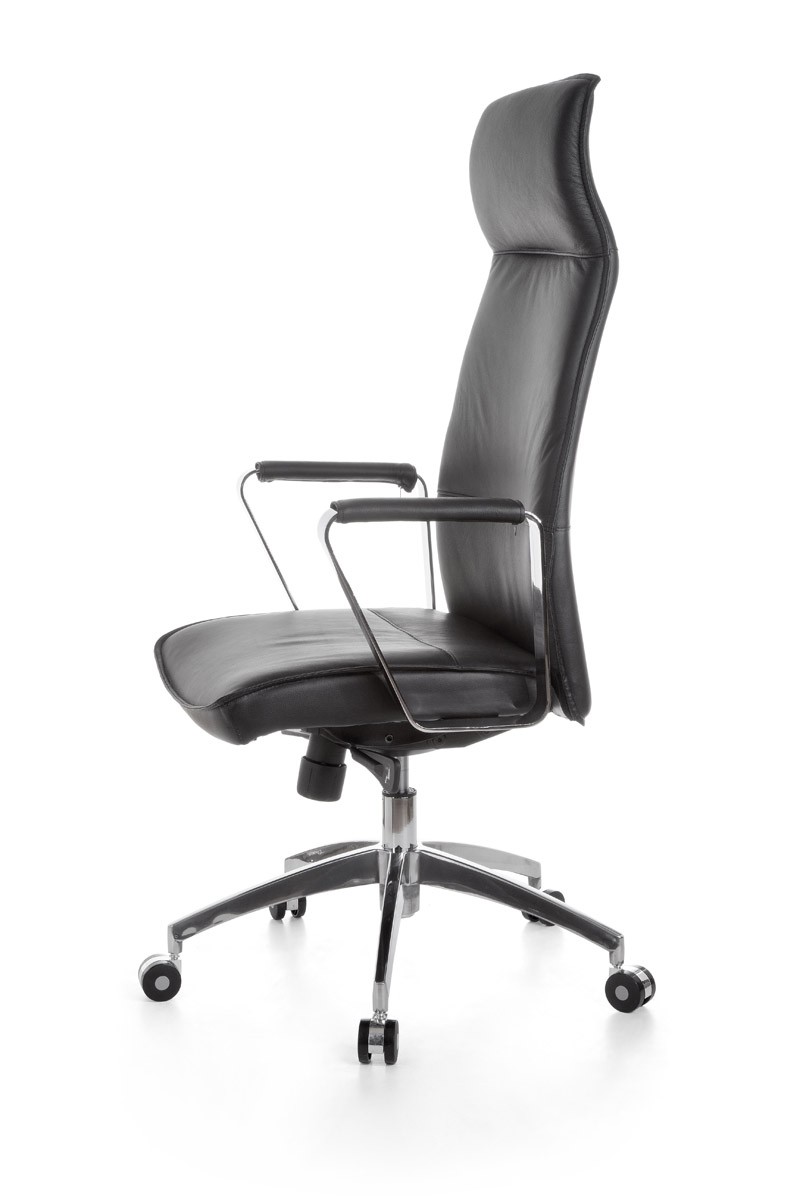 Dieser formschöne Echtleder Chefsessel hat eine extra große Sitzfläche. Die Sitzhöhe und der Gaslift sind von 44 - 53 cm einstellbar. Metall Armlehnen verchromt mit weicher Polsterung in Leder Optik (abnehmbar). Das Gestell des ästhetischen Aluminium-Fußkreuz ist verchromt.