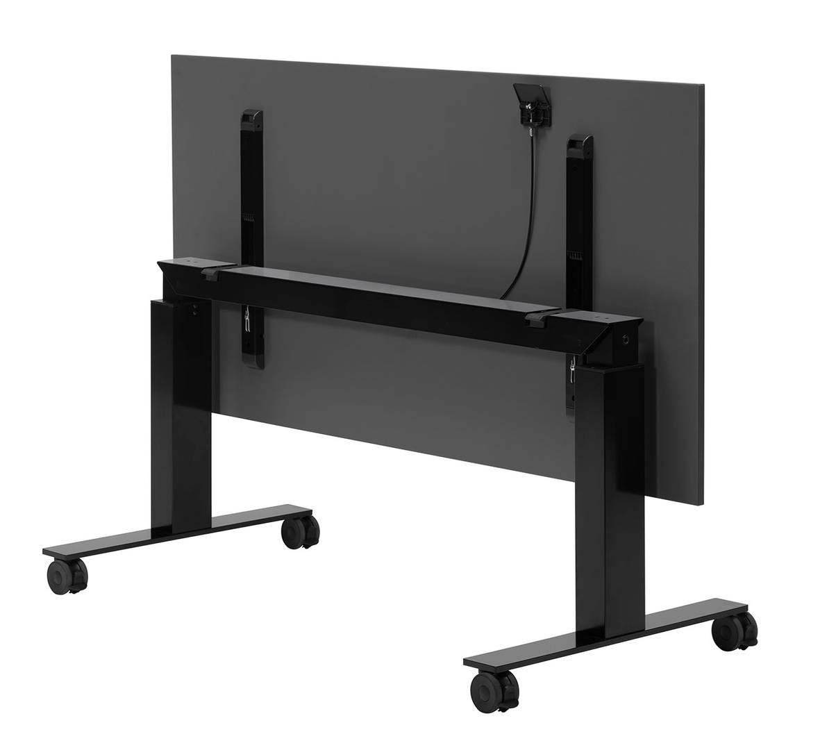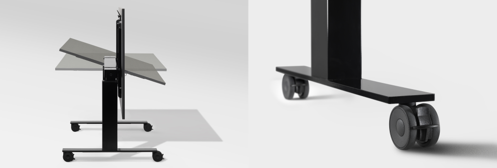 Durch die Höhenverstellung und seine abklappbare Tischplatte lässt der rise sich auch als Leinwand bzw. Projektionsfläche verwenden und platzsparend verstauen.