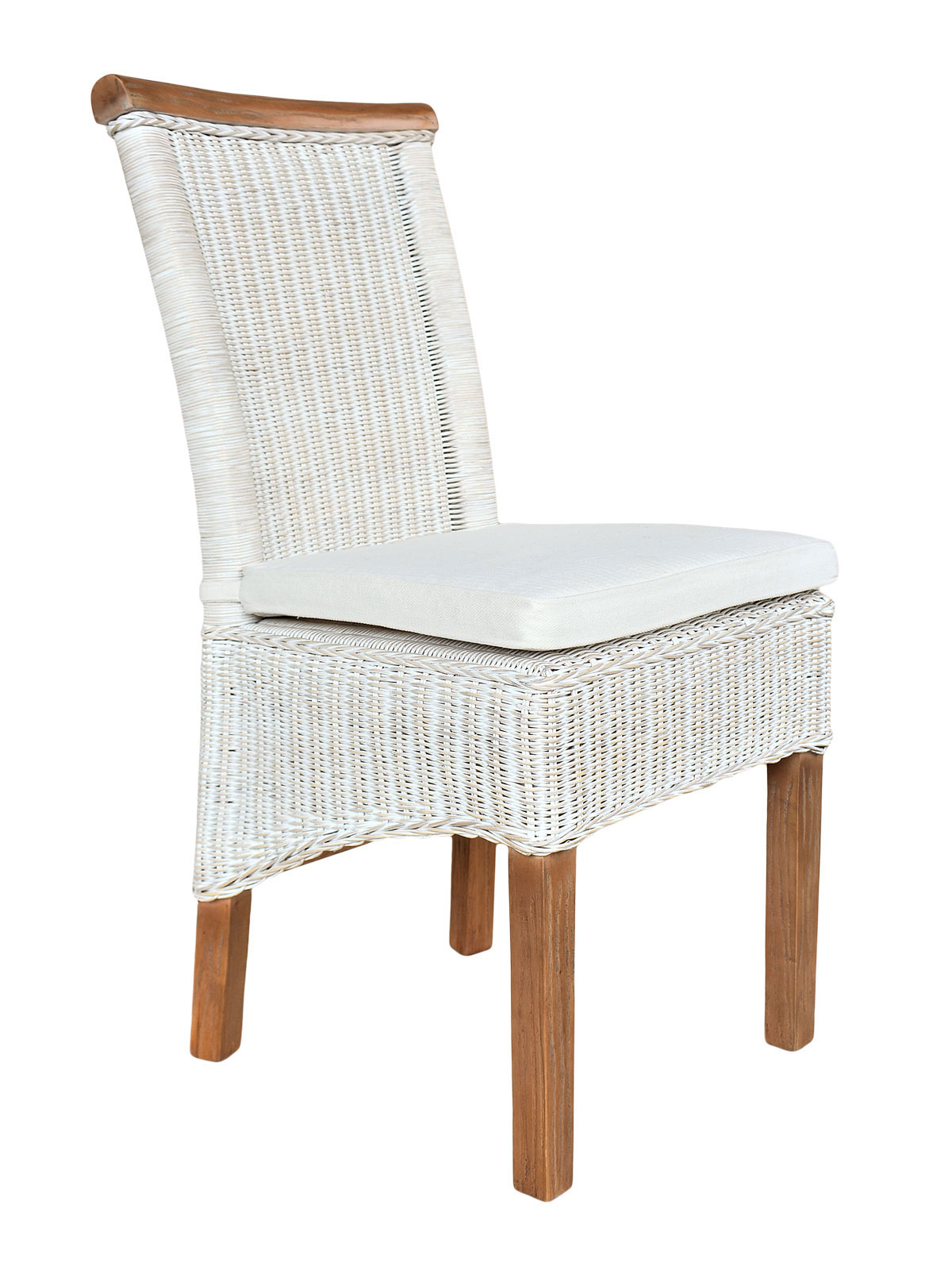 Hochwertig verarbeiteter Rattanstuhl mit Griffleiste für Esszimmer oder Wintergarten in weiß Stuhl mit robuster Bauweise und hoher Stabilität und Festigkeit (Tragkraft ca. 200 kg) Esszimmer-Stuhl mit hoher Strapazierfähigkeit und sehr guten Gebrauchseigenschaften Rattan-Stuhl aus 100 % FSC-zertifiziertem Naturrattan für Nachhaltigkeit 100 % natürliches Wohnen Sitzkissen mit Schleife in Schaumstoffstärke 3 cm, Bezug Leinen weiß abzieh- und handwaschbar Material: Geflecht Naturrattan, Beine und Griffleiste Pinie massiv Die Rattanstühle Perth sind hochwertig verarbeitete Stühle für Esszimmer oder Wintergarten aus Naturrattan. Ihr wirklich gutes Preis-Leistungs-Verhältnis und die hochwertige, robuste Bauweise zeichnen sie aus. Die straff geflochtenen Rattanruten sorgen für hohe Stabilität, sodass die Stühle eine Tragfähigkeit von bis zu 200 kg aufweisen. Alle Rundungen und Übergänge sind formschön und mit viel Liebe zum Detail verarbeitet. Die Rattanstühle haben am Lehnenkopf eine Griffleiste zum besseren Transport. Passend zu den Stühlen erhalten Sie die Sitzkissen in der Farbe Leinen weiß. Die Stühle haben Kunststofffußgleiter, so dass Parkett und Fußböden beim Schieben nicht beschädigt werden. Die Esszimmerstühle aus Rattan passen von der Farbgebung her perfekt zu Rattantischen, aber auch zu Massivholztischen in Eiche, Akazie, Buche, Seesham und Pinie.