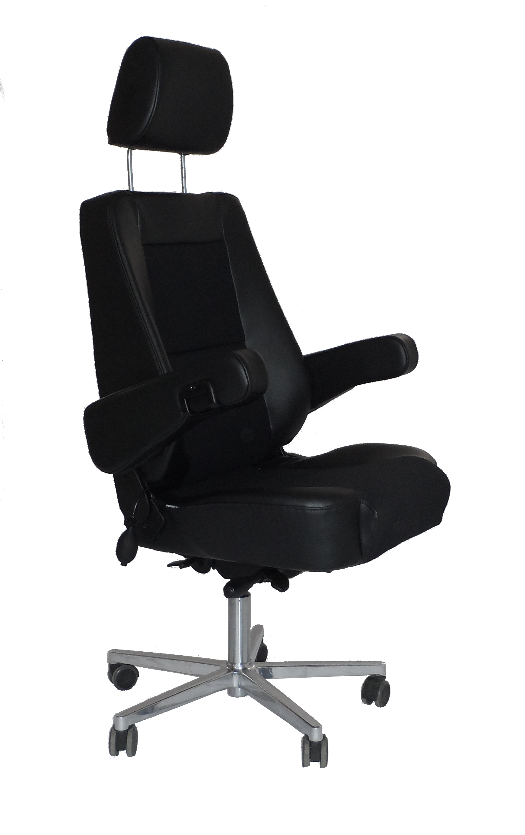 - vollgepolsterte Armlehnen höheneinstellbar und nach oben wegklappbar, mit schwarzen Echt-Leder bezogen