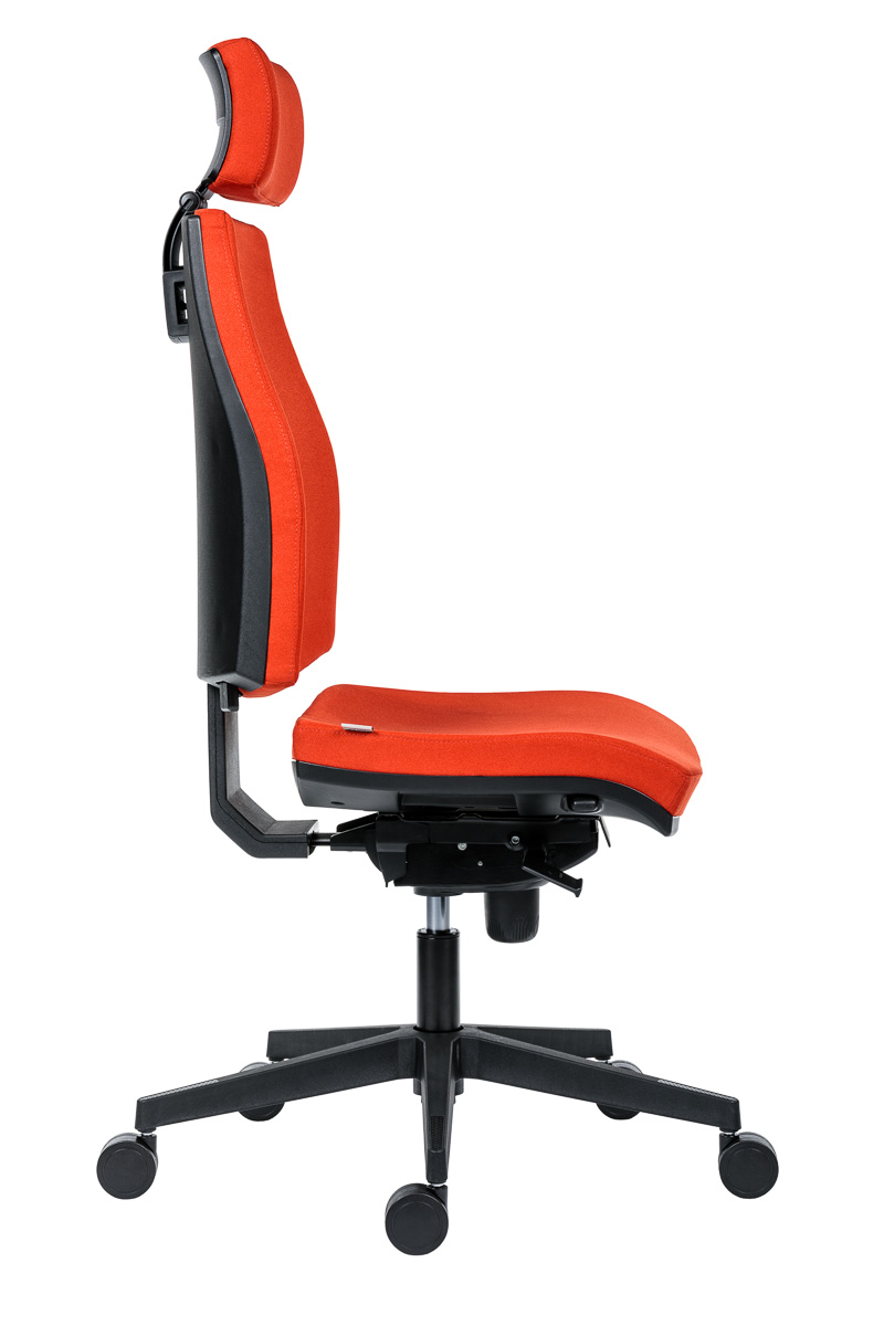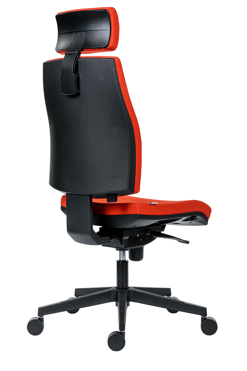Er besitzt eine multifunktional Synchronmechanik mit individuell einstellbarem und arretierbarem Gegendruck mit stufenloser Gewichtseinstellung von 45 - 150 kg., wahlweise auch mit automatischer Gewichtseinstellung. Der Schiebesitz ermöglicht eine Sitztiefenverstellung von bis zu 6 cm. Die ergonomische Rückenlehne mit Anti-Shock-Funktion läßt sich per Druckknopf in der Höhe verstellen. Eine stufenlose Sitzhöhenverstellung per Sicherheits-Gaslift ist in drei verschiedenen Sitzhöhen möglich. Komfortable Profi-Qualität für den Einsatz von 12 Stunden und mehr!