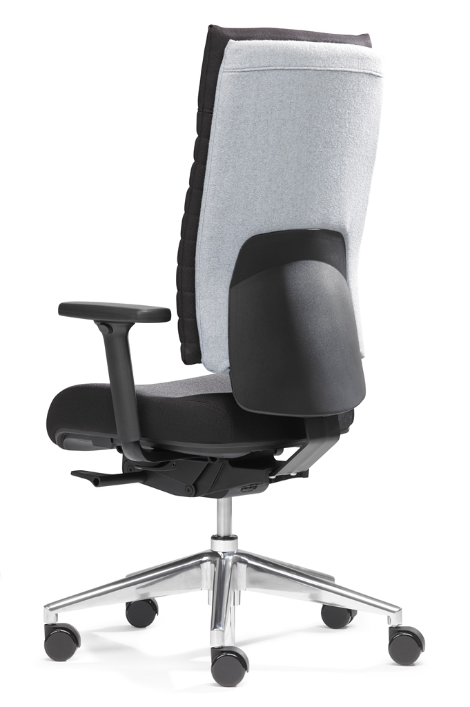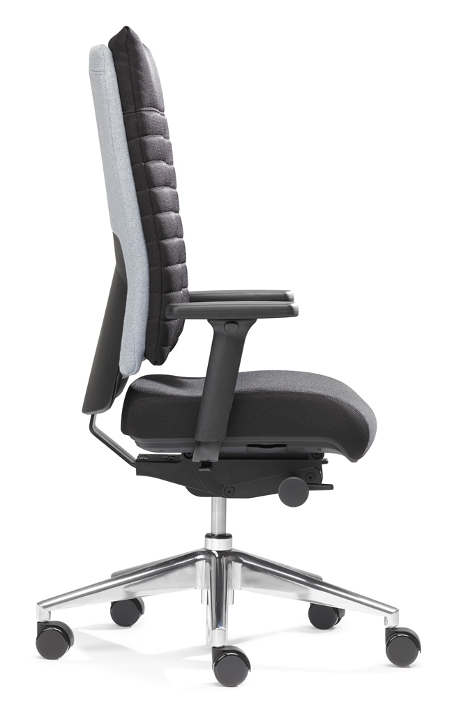 - Rückenlehne mit ergonomischer Stützpolsterung, integrierter Lordosenstütze und Mehr-Zonen-Kissensteppung