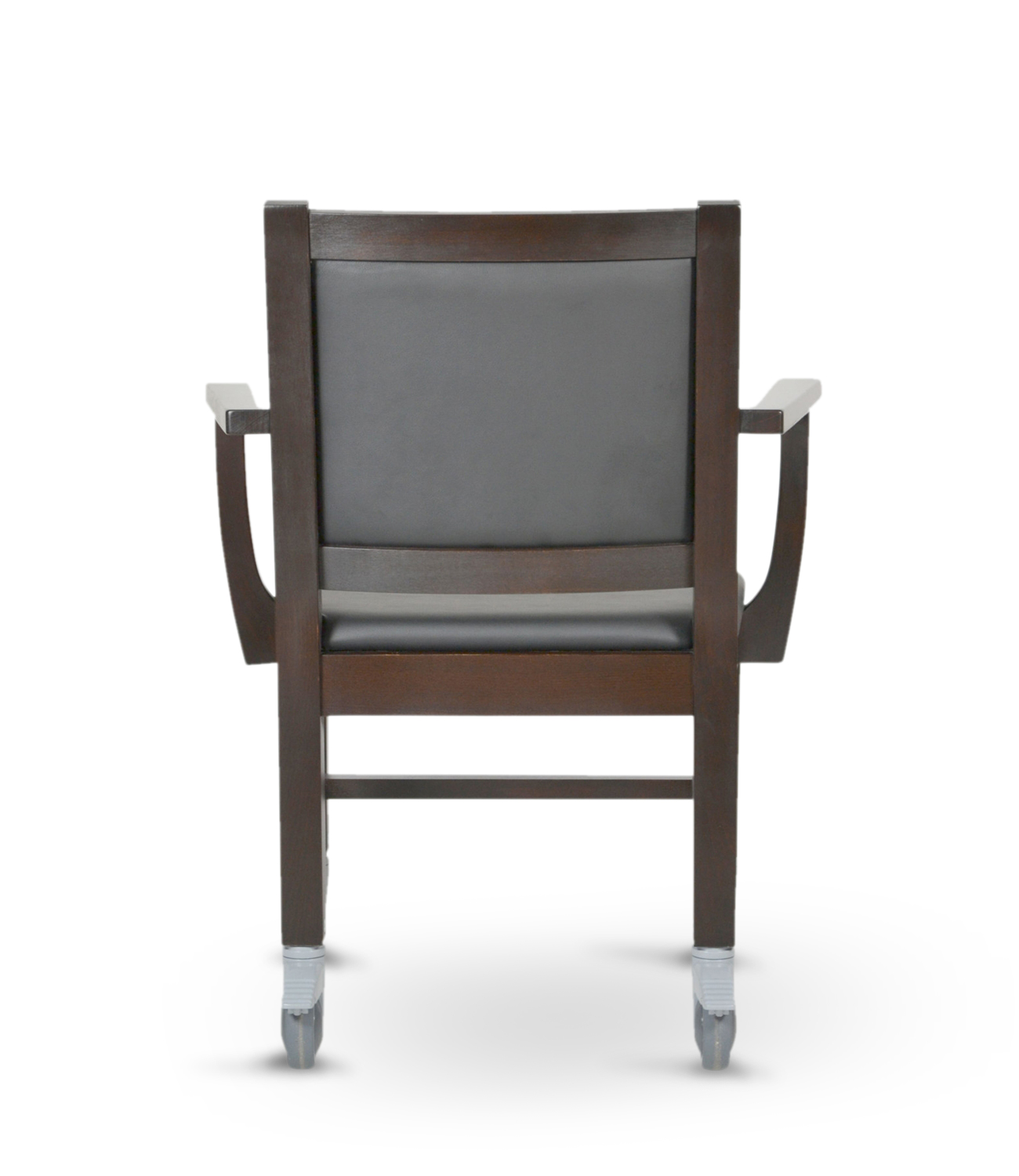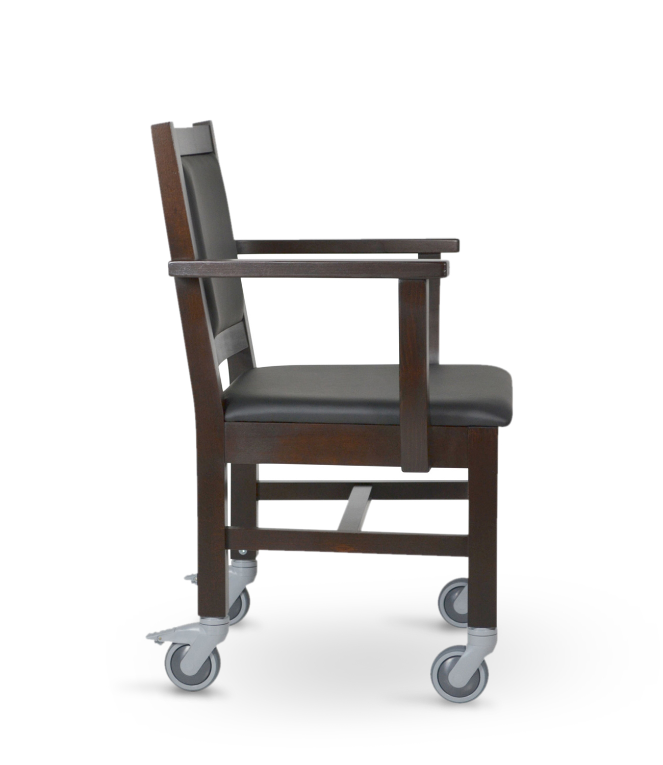 XXL–Holzstuhl mit Rollen für Schwergewichtige und Adipositas-Patienten mit extra stabilen Armlehnen und bis 250 kg geeignet. Die optional erhältlichen stabilen Armlehnen verfügen über extra einen Armlehnknauf, der weit nach vorne reicht und somit das Aufstehen erleichtert.