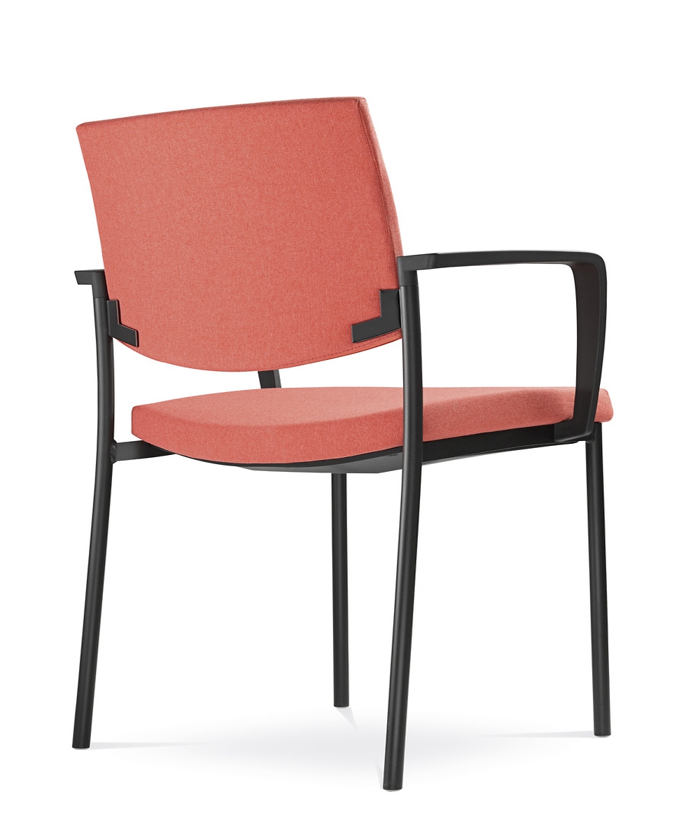 Das pulverbeschichtete 4-Fußgestell ist in schwarz oder verchromt erhältlich und mit abriebfesten Kunststoffgleitern ausgestattet. Optional sind auch Filzgleiter möglich. Das extra starke Sitz- und Rückenpolster kann mit verschiedenen Objektbezügen geliefert werden, während schwarze Kunststoffarmlehnen als zusätzliche Option zur Verfügung stehen.